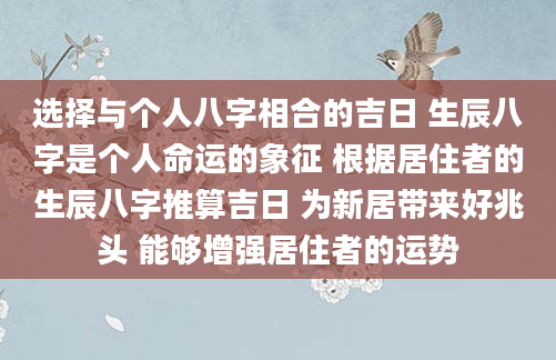 选择与个人八字相合的吉日 生辰八字是个人命运的象征 根据居住者的生辰八字推算吉日 为新居带来好兆头 能够增强居住者的运势