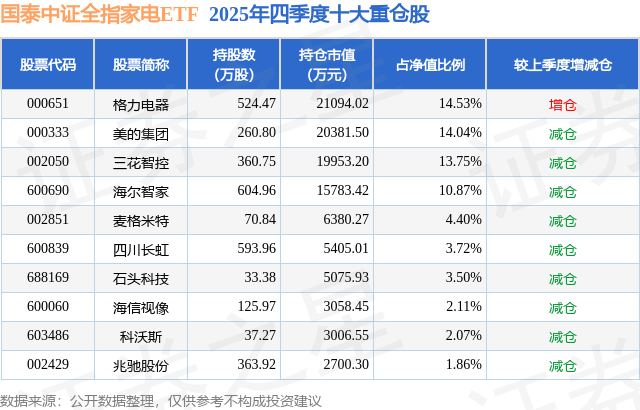2月24日国泰中证全指家电ETF基金份额减少1000万份,重仓股格力电器、美的集团、三花智控
