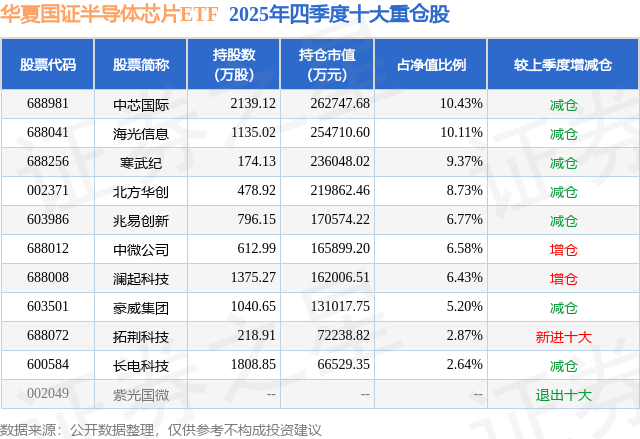 2月24日华夏国证半导体芯片ETF基金份额减少1120万份,重仓股中芯国际、海光信息、寒武纪