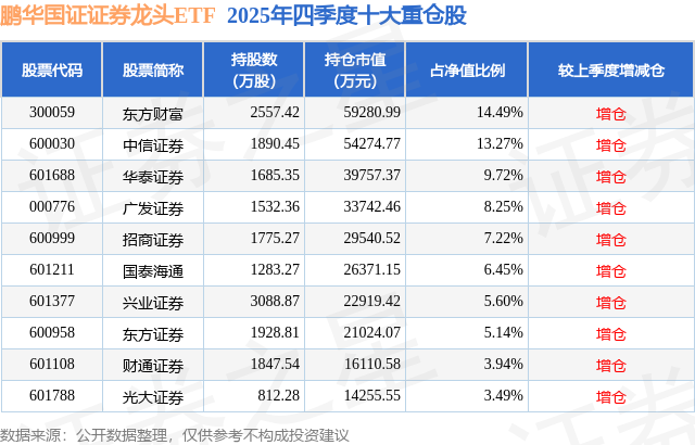 鹏华国证证券龙头ETF基金成立于2019年12月26日,基金经理为余展昌,基金跟踪标的为国证证券龙头指数,成立以来超额回报为10.84%,近一个月超额回报为0.13%。最新披露的基金持仓数据显示,截止2025年12月31日,该基金第一大重仓股为东方财富(300059),持股占比为14.49%。