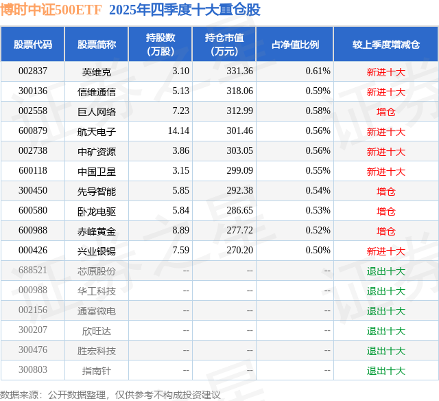 2月24日博时中证500ETF基金份额增加40万份,重仓股英维克、信维通信、巨人网络