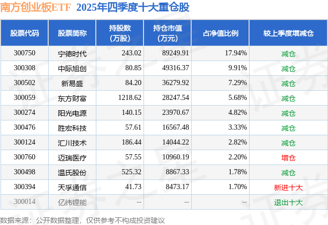 2月24日南方创业板ETF基金份额增加100万份,重仓股宁德时代、中际旭创、新易盛