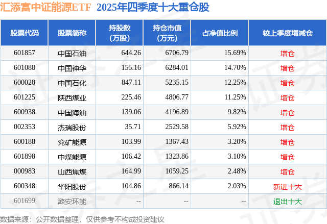 汇添富中证能源ETF基金成立于2013年8月23日,基金经理为董瑾 孙浩,基金跟踪标的为中证能源指数,成立以来超额回报为11.37%,近一个月超额回报为-0.12%。最新披露的基金持仓数据显示,截止2025年12月31日,该基金第一大重仓股为中国石油(601857),持股占比为15.69%。