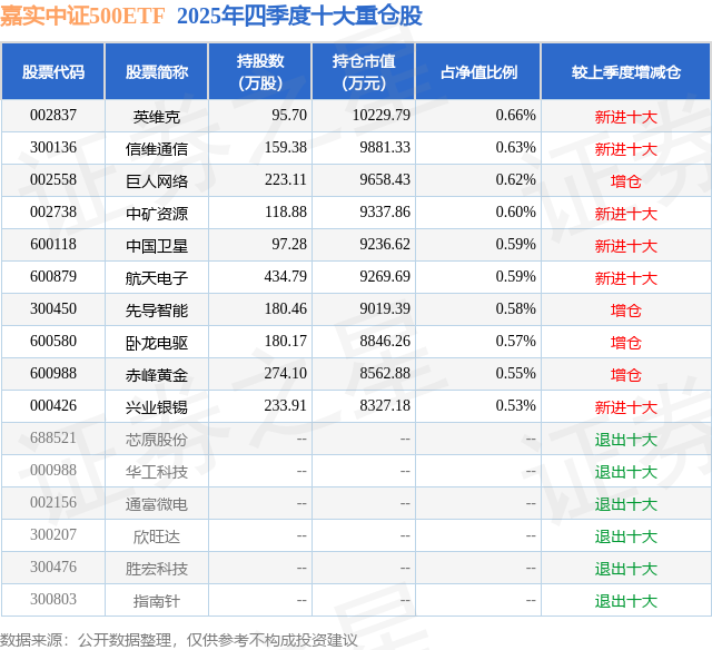 2月24日嘉实中证500ETF基金份额增加1300万份,重仓股英维克、信维通信、巨人网络