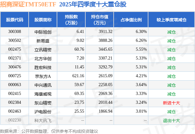 招商深证TMT50ETF基金成立于2011年6月27日,基金经理为侯昊,基金跟踪标的为深证电子信息传媒产业50指数,成立以来超额回报为19.2%,近一个月超额回报为-0.05%。最新披露的基金持仓数据显示,截止2025年12月31日,该基金第一大重仓股为中际旭创(300308),持股占比为6.3%。