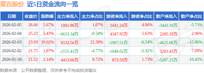 2月5日的资金流向数据方面,主力资金净流入1001.86万元,占总成交额1.67%,游资资金净流入2441.24万元,占总成交额4.06%,散户资金净流出3443.1万元,占总成交额5.73%。